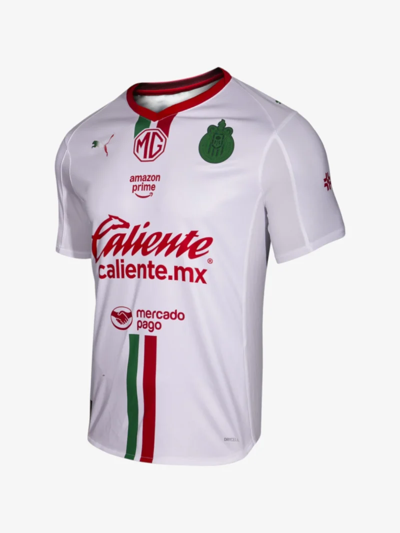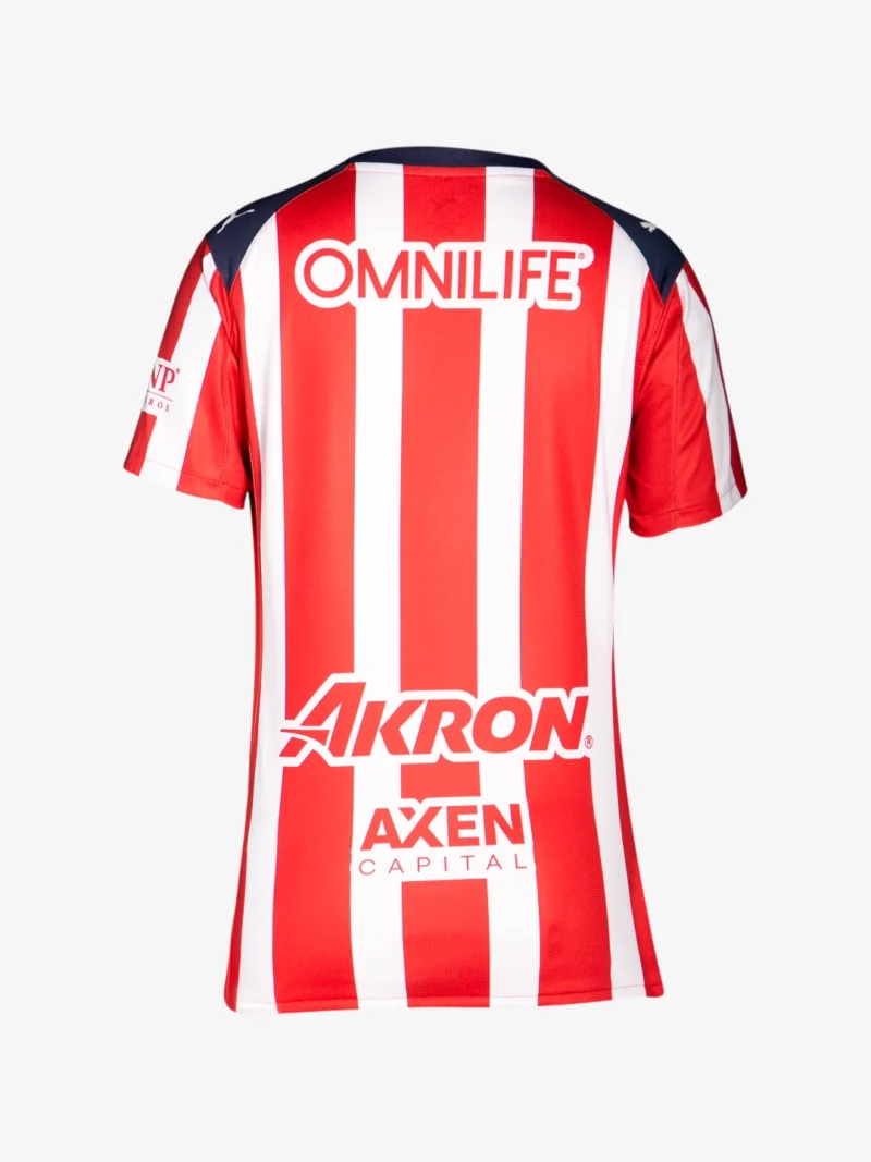 Viste tu pasión por el Rebaño con el Jersey Chivas Local 2024-25 de Puma. Este uniforme oficial replica fielmente el diseño clásico rojiblanco con rayas envolventes en cuerpo y mangas, cuello y puños azul marino para un acabado moderno. Fabricado en poliéster ligero con tecnología dryCELL, garantiza ventilación y secado rápido durante el partido o tu día a día